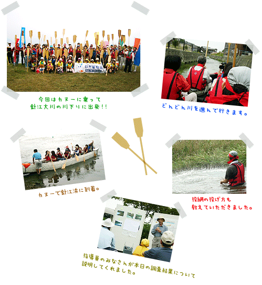 高島市針江地区をながれる針江大川をカヌーで下りました。カヌーで町並みをぬけ、ヨシのはえている内湖に向かいました。水上からみる水辺の風景は、陸からみる景色とはちがいとても神秘的な景色でした。